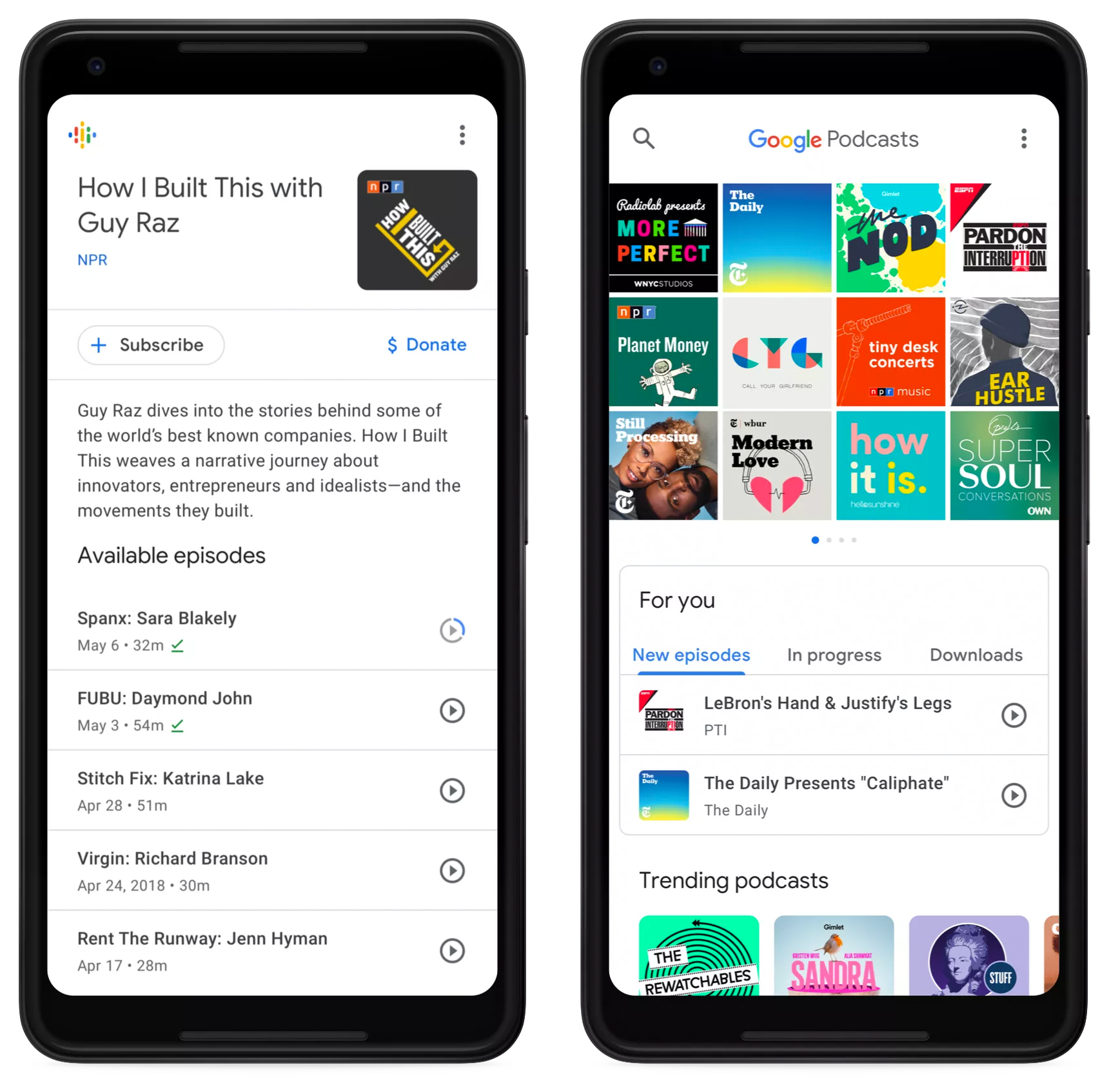 Comme avec beaucoup d'autres produits de moteur de recherche, les podcasts ont des algorithmes de recommandation intégrés qui offrent un nouveau contenu basé sur les préférences, les habitudes et les goûts de l'utilisateur. Plus de 2 millions de podcasts sont disponibles pour l'écoute. Les utilisateurs peuvent régler la vitesse de lecture, sauter des pauses, télécharger des épisodes et visionner des épisodes qui n'ont pas été complètement entendus.